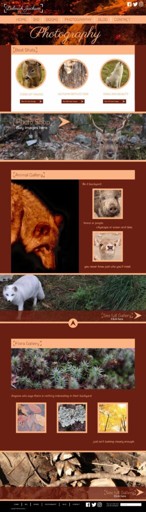 The photography page posed a great challenge: how to display a bunch of great photography while making sure the pictures don’t fight with each other? I chose much fewer photos to put on display in favour of having larger galleries on sub-pages by category. The “photo shop” has also been moved to the photography page to minimize confusion and a more pleasant user experience.